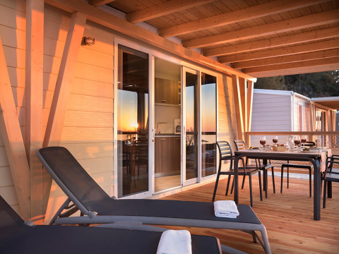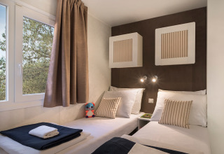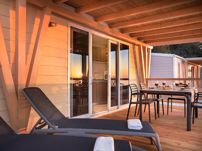 All'interno troverai uno spazio abitativo accogliente di 32 m² più una terrazza chiusa di 24 m² con posti a sedere, lettini prendisole e un barbecue. La casa può ospitare comodamente quattro adulti e due bambini, grazie a due camere da letto (una con letto matrimoniale alla francese, una con letti singoli), un divano letto nel soggiorno e due bagni moderni con doccia. La cucina completamente attrezzata include un microonde e un piano cottura elettrico, mentre l'aria condizionata e la TV satellitare garantiscono un comfort extra.