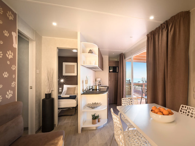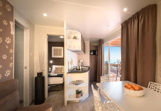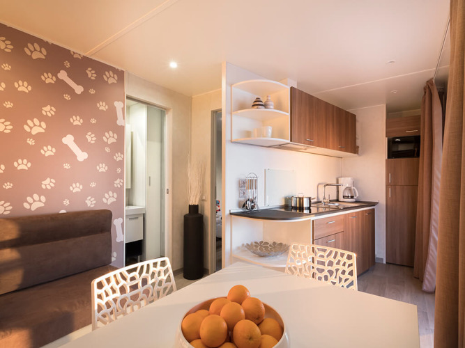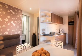 La Happy Dog Home 4+2 è progettata per offrire comfort sia alle famiglie che ai loro animali domestici. Situata nel villaggio pet-friendly vicino alla Baia di Tar, a pochi passi dalla spiaggia di ciottoli e rocce, questa sistemazione offre l'ambiente perfetto per una vacanza rilassante al mare. L'esclusiva Pet Paradise presenta aree giochi per cani, campi per passeggiate e numerosi extra come un negozio di articoli per animali, un salone di toelettatura, una doccia per animali e perfino un'area per il pet sitting. Ogni casa mobile è recintata in modo sicuro, offrendo ai vostri amici a quattro zampe tanto spazio per godersi l'aria aperta in libertà.