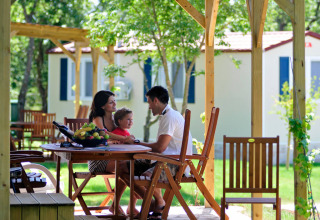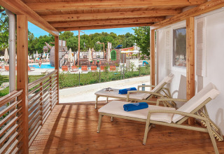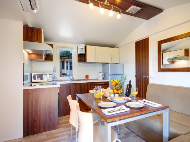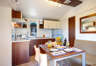 La cucina è dotata di microonde, forno, bollitore e macchina per il caffè, mentre l'area soggiorno è fornita di TV LCD SAT. L'aria condizionata garantisce un soggiorno piacevole per tutta la stagione. All'esterno, un'ampia terrazza coperta di 27 m² con sedie a sdraio invita al relax, mentre il giardino circostante offre tanto spazio ai bambini per giocare.