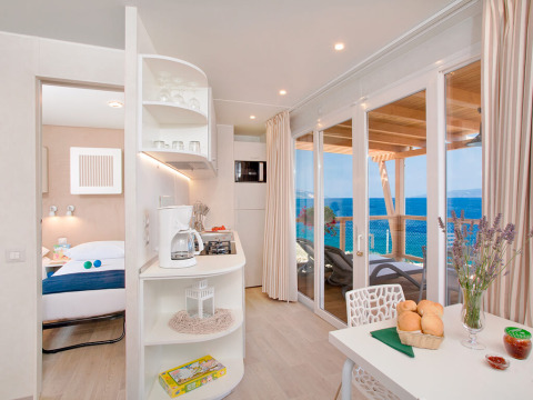 La Marina Home (32 m²), costruita nel 2017, offre un interno luminoso e accogliente, valorizzato da ampie finestre panoramiche e accesso diretto a una grande terrazza coperta. Goditi viste mozzafiato sul mare dall’area soggiorno/pranzo o rilassati sulla terrazza arredata con mobili da esterno—ideale per il caffè del mattino o cene al tramonto.