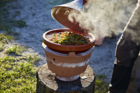 Questa tenda safari unica è dotata di tutti i comfort per una perfetta vacanza glamping! La tenda dispone di una veranda accogliente con tettoia, dove puoi rilassarti piacevolmente all'aperto. All'interno trovi una cucina completamente attrezzata con stoviglie e un fornello a gas a quattro fuochi con protezione. Inoltre sono presenti un frigorifero, una macchina da caffè e un bollitore.