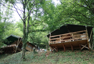Vivi l'esperienza definitiva di "Slow Glamping" in questa robusta Safaritent completamente arredata con un proprio bagno. Questa sistemazione di 35 m² è adatta per un massimo di cinque ospiti, si trova su un solido terrazzo in legno e offre il perfetto equilibrio tra vita all'aperto e comfort moderno. Ciò che rende davvero speciale questa tenda è l'unità sanitaria privata—dotata di doccia, WC e lavandino—situata proprio accanto alla tenda, così da avere il massimo spazio abitativo e privacy all'interno! L'interno ha un caldo aspetto in legno con un ampio soggiorno e due confortevoli camere da letto dotate di materassi boxspring, piumoni e cuscini (biancheria da letto inclusa!). L'ampia veranda è ideale per la vita all'aperto, completa di comodi divani lounge, un tavolo da pranzo con panche e una cucina esterna mobile con un fornello a gas a quattro fuochi.