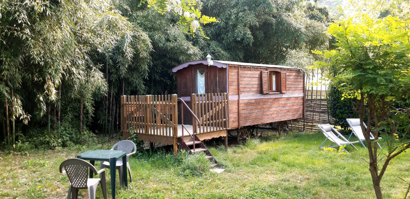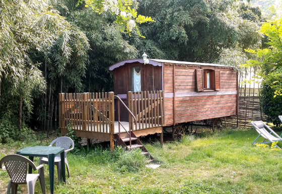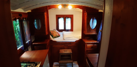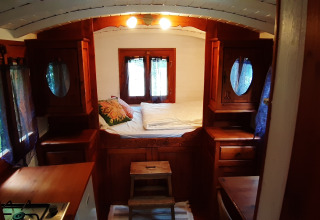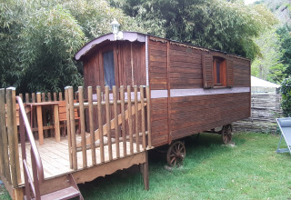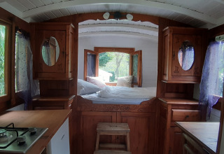 La Tiny Wagon è un alloggio compatto e autentico per due persone. Si trova ai margini di un piccolo boschetto di bambù e offre un'atmosfera romantica immersa nella natura. La facciata in legno, la panca da cocchiere, le ruote in legno e il letto ad alcova accogliente conferiscono alla caravan un carattere caldo e bohemien. All'interno troverai una cucina pratica con frigorifero-congelatore, fornello a gas, microonde, macchina da caffè e stoviglie. C'è un piccolo bagno con doccia e lavabo e un WC separato. La caravan è dotata di elettricità e riscaldamento. Il soffitto è basso, circa due metri. All'esterno c'è una terrazza in legno su palafitte con tavolo, sedie e due lettini, con vista sulle montagne. Un animale domestico è ammesso con un supplemento.