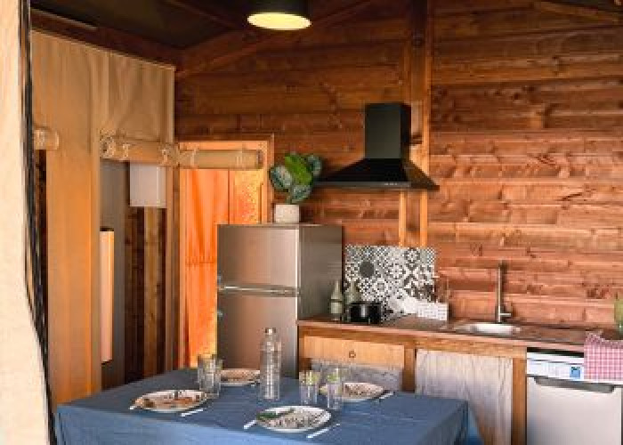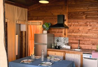 Questa suggestiva tenda safari, realizzata in legno e tela, offre un'esperienza glamping confortevole immersa nella natura. Grazie a una disposizione intelligente e a un'atmosfera accogliente, è un luogo perfetto per rilassarsi. All'interno troverai una zona giorno accogliente con tavolo da pranzo, area salotto e televisore, nonché una cucina a vista con frigorifero con vano congelatore, piano cottura, microonde e lavastoviglie.