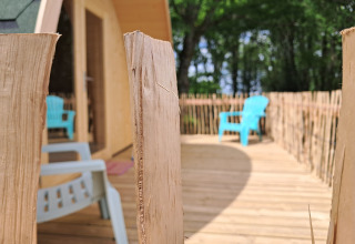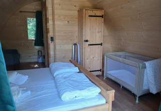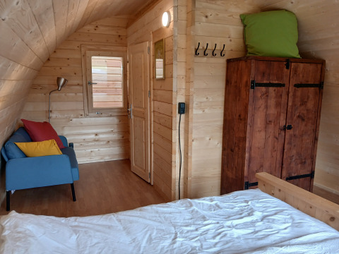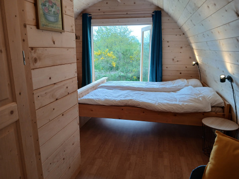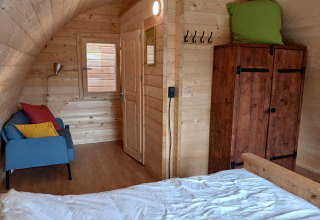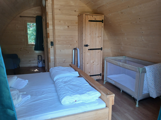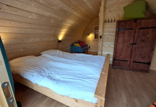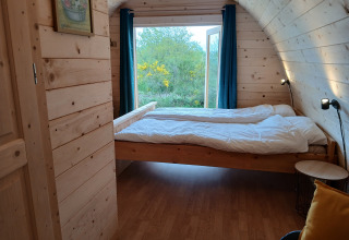 Questo accogliente Camping POD di 24 m² è arredato come un'ampia sistemazione per 4 persone con due aree notte: una cameretta per bambini e una camera matrimoniale con spazio per una culla. Il POD dispone di comodi letti veri in robusto legno d'abete. Il letto matrimoniale misura 160 × 210 cm, i due letti singoli per bambini 80 × 200 cm. Il POD è situato su una terrazza rialzata in legno.