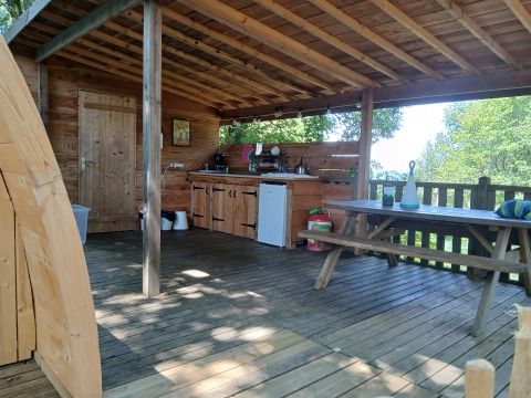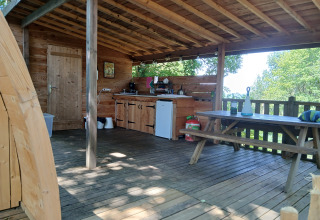 Sotto la copertura in legno si trova una cucina esterna completamente attrezzata con fornello a 4 fuochi, frigorifero e stoviglie. Qui è possibile anche raccogliere i rifiuti in modo differenziato.