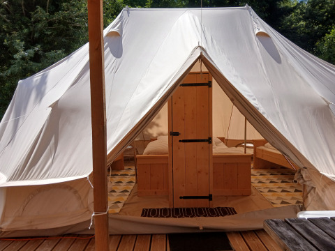 Questa Emperor Bell Tent ha una superficie di 25 m² ed è arredata come una spaziosa tenda per 4 persone, con un letto matrimoniale e due letti singoli. C'è spazio per massimo una culla. La tenda è posta su un'ampia pedana di circa 50 m² e dispone di un grande ambiente unico con letti robusti in legno fatti a mano. Il letto matrimoniale misura 160 x 200 cm, i letti singoli 80 x 200 cm. I comodi materassi ortopedici sono spessi 19 cm, anti-allergici e realizzati in schiuma fredda HR. Inoltre troverai un ampio armadio, una lampada atmosferica e una presa multipla.