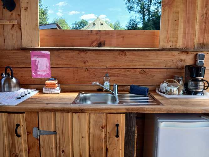 La Emperor Bell Tent dispone di una spaziosa cucina esterna con acqua calda e fredda (boiler da 20L alimentato a energia solare), un fornello a gas a 4 fuochi, frigorifero e attrezzatura completa. Sotto la tettoia c'è un grande tavolo da picnic per 6 persone, due contenitori per la conservazione e raccolta differenziata dei rifiuti. La tenda è situata in una zona tranquilla e spaziosa e dispone di extra come un'amaca e due comode poltrone lounge.