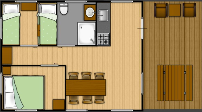 L'eco-lodge è costruita in legno di Douglas europeo certificato FSC ed è arredata con mobili in legno di recupero. Ulteriore comfort è garantito dai lunghi materassi ortopedici (210 cm) in schiuma fredda di alta qualità ed anallergica.