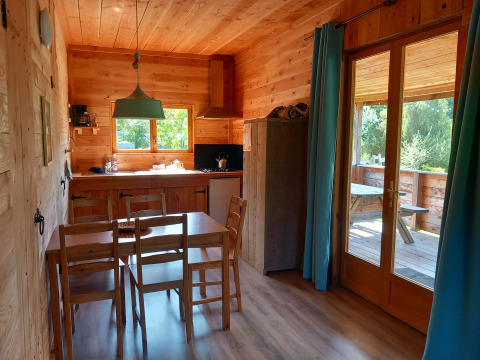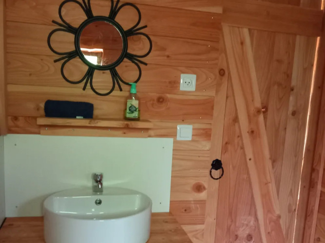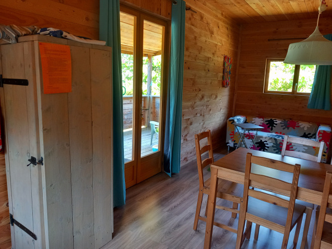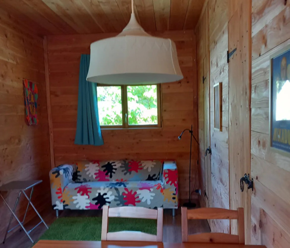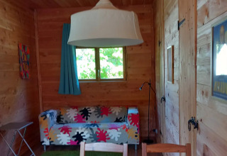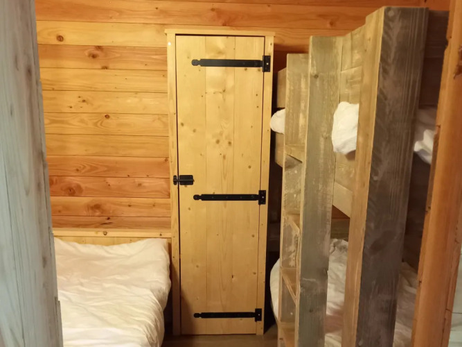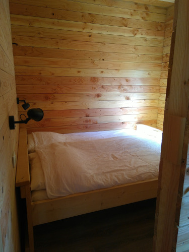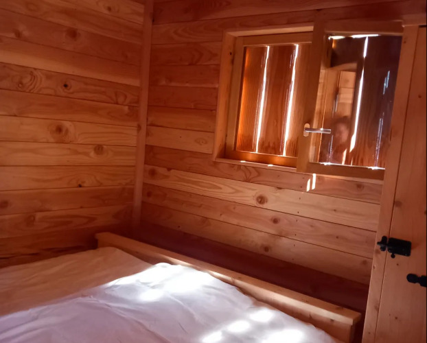 Questo accogliente e confortevole eco-chalet dispone di due camere da letto. La camera matrimoniale ha un letto a due piazze con materassi ortopedici extra lunghi (90 x 210 cm), ideale per un buon riposo notturno anche per ospiti più alti. La seconda camera è arredata con un letto singolo e un letto a castello, adatta per bambini o giovani adulti.