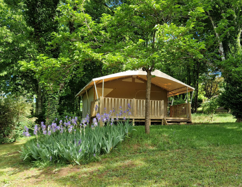 Grande tenda lodge attrezzata di 20m² per cinque persone con una terrazza coperta e servizi privati.