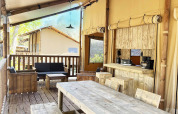 Séjour effectué le 7 août 2025 Le logement ne correspondait ni aux photos, ni à la description du site et de notre réservation : de grande tente avec lit double et kitchenette, nous sommes tombés sur une petite tente sans électricité avec deux lits simples aux matelas en plastique. En effet : les photos de la réservation montraient les tentes PREMIUMS bien que la réservation était pour les tentes simples ! Je qualifierai cela de publicité fallacieuse, pour ne pas dire mensongère. La "cuisine commune" est un espace comprenant exactement deux plaques de cuisson, un frigo, un micro-ondes et quelques ustensiles (pour l'entièreté du camping). La piscine non surveillée, petite et globalement décevante au vu de la place qu'elle prend dans la présentation internet du camping. Les seuls éléments agréables étaient basiquement la rivière juste à côté (gratuite) et le bar qui fait des chouettes soirées juste à côté (pas relié au camping donc). En bref : cadre magnifique, mais les seuls bons éléments à proximité ne viennent pas du camping.
