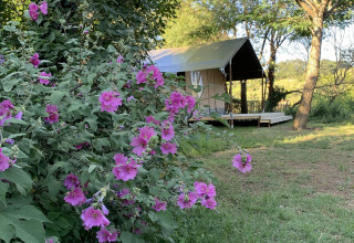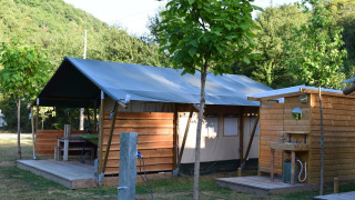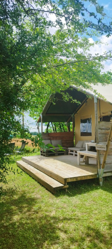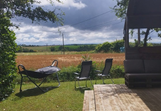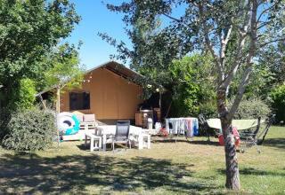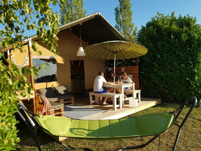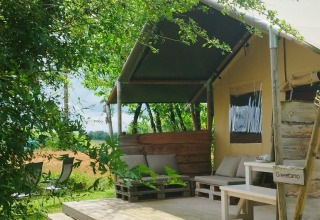 Sulla veranda puoi rilassarti su due divani lounge o sull'amaca. Sul posto campeggio c'è anche un tavolo da pranzo in legno con panche e due sedie da campeggio regolabili. La tenda non dispone di bagno privato; si utilizzano i servizi igienici del campeggio. Grazie all'ampia veranda e alle strutture esterne, la vita all'aperto è qui al centro dell'esperienza.