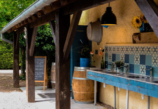 Questa robusta safaritent si trova su una piattaforma di legno e offre un'esperienza glamping confortevole nel mezzo del campeggio. All'interno troverai un ampio soggiorno con tavolo da pranzo e panche, e due camere da letto. I genitori dormono su comodi materassi boxspring e nella seconda camera da letto ci sono due letti a castello. Cuscini, piumoni e biancheria da letto sono inclusi. All'interno della tenda c'è un angolo cottura con attrezzatura completa, un grande frigorifero con congelatore e una macchina Nespresso. Per cucinare c'è una cucina esterna mobile con un fornello a gas a 4 fuochi.