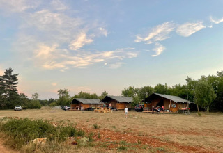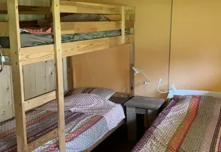 Questa robusta tenda safari si trova su una pedana in legno e offre un'esperienza di glamping confortevole nel mezzo del campeggio. All'interno troverai un ampio soggiorno con tavolo da pranzo e panche e due camere da letto. I genitori dormono su comodi materassi boxspring e nella seconda zona notte ci sono due letti a castello. Cuscini, piumini e biancheria da letto sono inclusi. Nella tenda c'è un angolo cottura attrezzato con un inventario completo, un grande frigorifero con freezer e una macchina Nespresso. Per cucinare, c'è una cucina da esterno mobile con piano cottura a gas a 4 fuochi.