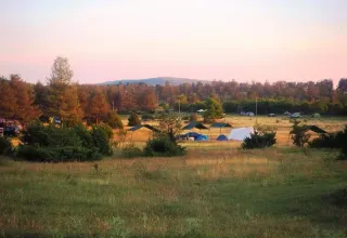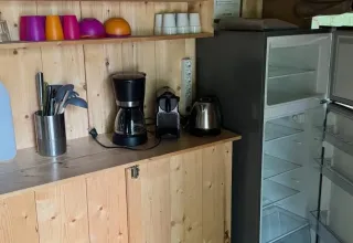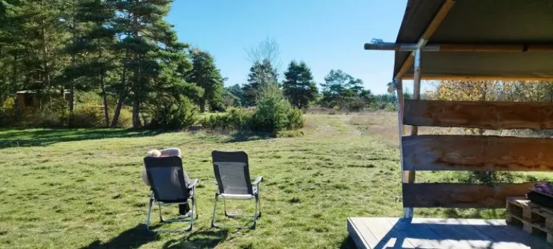 Sulla veranda puoi rilassarti su due divani lounge o sull'amaca. Nel posto campeggio c'è anche un tavolo da pranzo in legno con panche e due sedie da campeggio regolabili. La tenda non dispone di un proprio bagno; si utilizzano i servizi igienici del campeggio. Grazie all'ampia veranda e alle strutture esterne, la vita all'aperto è al centro qui.