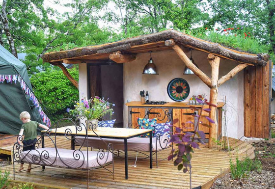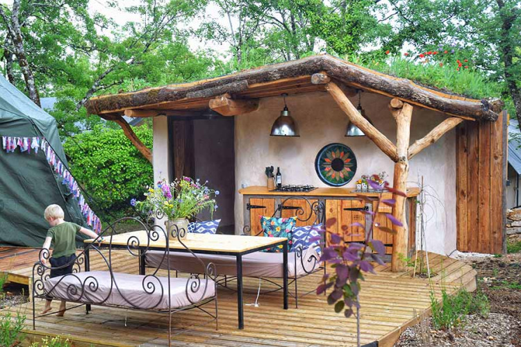 Una cucina esterna accogliente, protetta da un tetto piantumato, dotata di frigorifero/congelatore, microonde, lavello, piano cottura a 4 fuochi e tutte le stoviglie necessarie.
