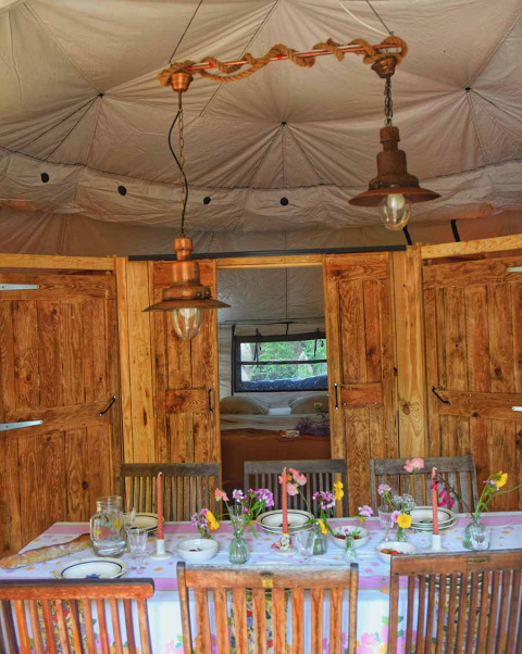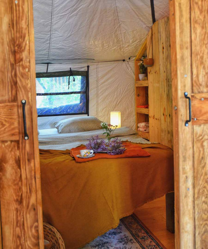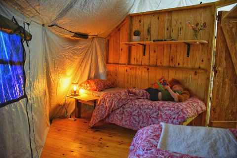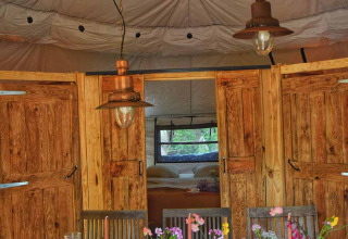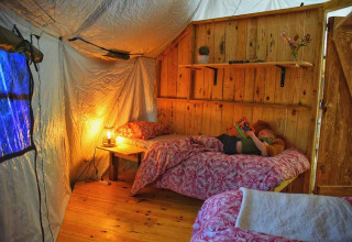 - 2 camere ciascuna con 2 letti singoli (80x200) Un grande tavolo da pranzo per 6 persone nella cupola. Un secondo tavolo da pranzo sulla terrazza, con ombrellone per pranzare o cenare all'ombra. Le grandi finestre in ogni camera da letto e 3 nel soggiorno garantiscono una buona ventilazione nella tenda.