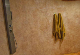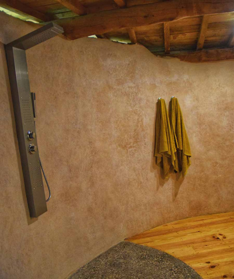 Un ampio bagno a forma di chiocciola, con una doccia a pioggia aperta, lavabo e WC. Il tetto piantumato garantisce che la temperatura nel bagno rimanga costante durante l'estate.