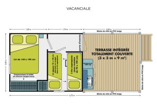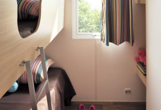 La Cabane Nature è la perfetta combinazione tra una casa mobile e una tenda. Con una superficie di 19 m² e due camere da letto, questa sistemazione unica è ideale per una famiglia di 2 adulti e massimo 3 bambini. La sistemazione dispone di una terrazza con telo in PVC completamente richiudibile e una zona notte con pareti solide e una porta chiudibile.