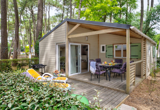 Potrai usufruire di una terrazza in legno coperta da 20 a 25 m² attrezzata con: 2 lettini con materassi, un tavolo da giardino e sedie per godersi appieno l’ambiente idilliaco per una vacanza rilassante. E senza dimenticare una plancha a gas per cucinare all’aperto e condividere momenti conviviali con la famiglia.