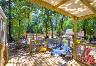 Potrai usufruire di un’ampia terrazza in legno di 25 m², coperta e protetta da un cancelletto.