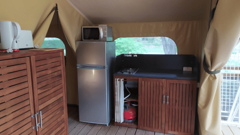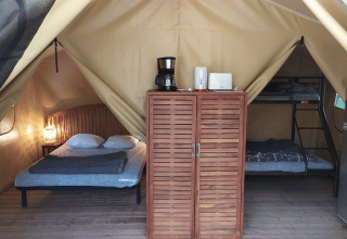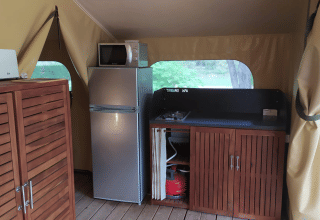 Fuggi dalla routine quotidiana e goditi un'elegante lodge su palafitte di 30 m² con una terrazza coperta in legno di 10 m². Vivi il piacere di stare insieme in un ampio soggiorno con cucina completamente attrezzata e scopri due camere da letto separate che garantiscono comfort e privacy. Questa cabane lodge combina il fascino della vita all'aperto con la comodità del campeggio moderno. Gli animali sono i benvenuti, così anche gli amici a quattro zampe potranno far parte dell'avventura. Senza bagno né toilette, ma con tutto lo spazio per vivere, cucinare e rilassarsi: qui tutto ruota intorno alla semplicità, alla natura e al sentirsi connessi. Perfetto per chi ama vivere all'aria aperta con quel tocco di lusso in più.