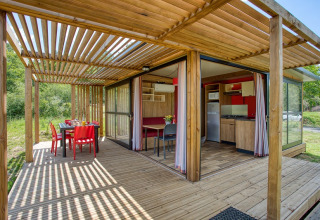 Vivi una confortevole esperienza all'aria aperta in una spaziosa tenda lodge per un massimo di cinque persone. Dormi in una stanza separata con un letto matrimoniale da 160×200 cm e un lussuoso materasso queen size, oppure scegli uno dei tre letti singoli nella seconda camera. Le zanzariere garantiscono aria fresca e tranquillità. Cucina con facilità nella cucina completamente attrezzata con fornelli a quattro fuochi, microonde, frigorifero e freezer, macchina del caffè e bollitore. Rilassati nell'accogliente soggiorno con mobili in legno o spostati sulla terrazza coperta di 15 m² con mobili da giardino e area salotto. Grazie alla sua posizione nel verde, la tenda rimane piacevolmente fresca in estate.