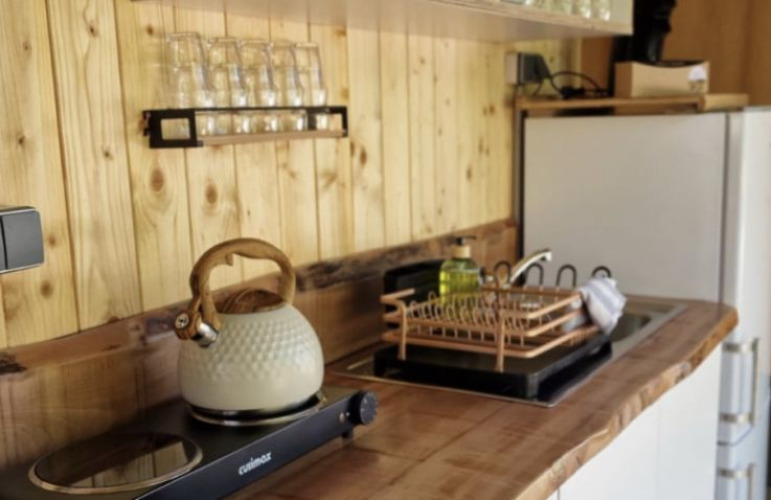 La moderna tenda safari del Camping Neumühle combina l'autentica esperienza del campeggio con un'ampia gamma di comfort ed è ideale per famiglie e gruppi. Dotata di due letti matrimoniali (140 x 200 cm), un letto a castello (90 x 200 cm), una nicchia per dormire (120 x 200 cm) e un divano letto (80 x 200 cm), la tenda offre spazio sufficiente per rilassarsi e trascorrere la notte. La tenda safari dispone di un bagno privato con doccia e servizi igienici e di una cucina funzionale con fornelli, frigorifero e lavello. Goditi il panorama e trascorri ore di relax sulla terrazza con area lounge.