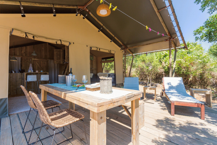 Alloggio La spaziosa tenda safari è arredata con gusto e dispone di una cucina completa, dotata di macchina da caffè, piano cottura a 4 fuochi, frigorifero e bar. L'ampio soggiorno è fornito di un divano ad angolo e la grande terrazza ha un tavolo da pranzo. Questa terrazza offre molta ombra ed è circondata da un giardino mediterraneo. La tenda safari dispone inoltre di un bagno con doccia, wc e lavandino. La tenda safari è adatta per 6 persone (con 3 camere da letto) oppure per 4 persone.