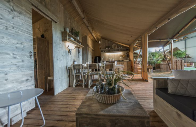 Le tende lodge di lusso sono adatte per 4 o 7 persone e dispongono di 2 o 3 camere da letto, a seconda del modello. La tenda rustica offre un soggiorno e una zona pranzo con cucina completamente attrezzata (frigorifero, piano cottura elettrico e lavabo). Avrai a disposizione un bel bagno con doccia, toilette e lavandino. Sono presenti anche una televisione, radio e lettore CD. La terrazza di fronte alla tenda lodge è arredata con comodi mobili in legno. Anche il riscaldamento è presente, ideale per le giornate più fredde.