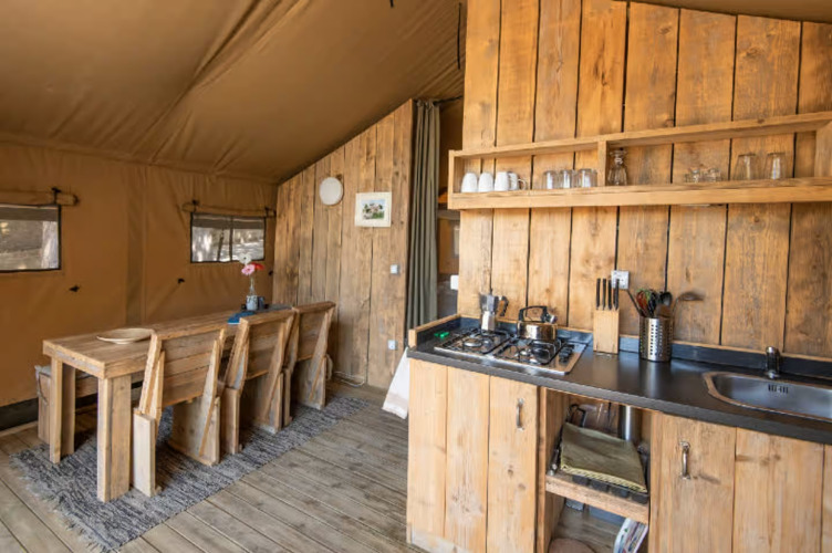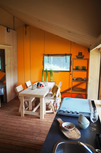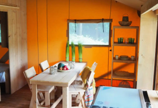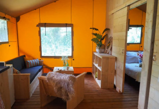 Safari Lodge Diva (6 persone) Ampia, pratica e conviviale. Questo lodge offre 38 m² interni e una veranda di 15 m² – perfetto per le famiglie numerose che desiderano più spazio.