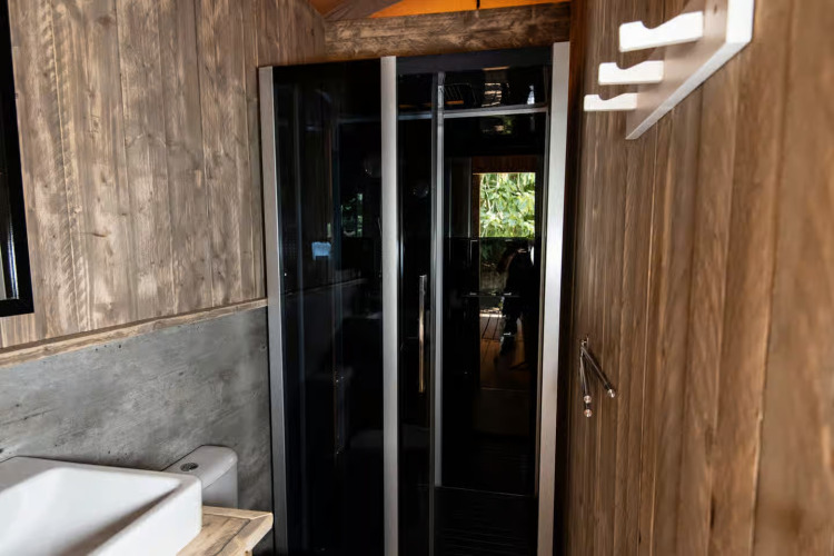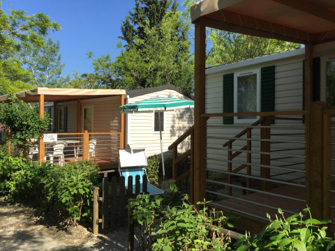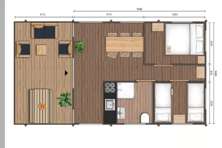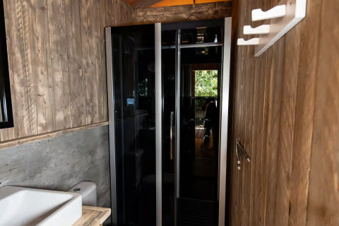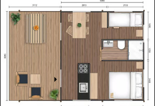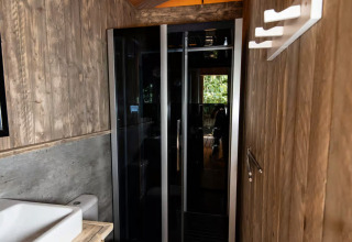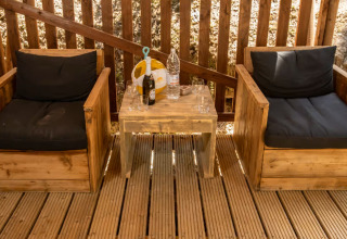 Luxury Lodge Diva (6 persone) Vuoi il massimo del lusso? Scegli il Luxury Lodge. Con 40 m² interni e una veranda spaziosa, è la sistemazione più grande e lussuosa del campeggio. Qui vivi il glamping al massimo livello.