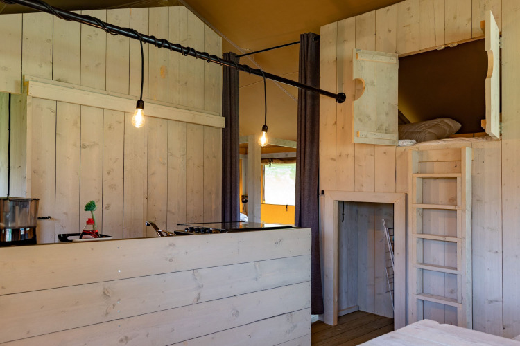 Le tende lodge sono ancora più spaziose delle tende safari e possono ospitare fino a 7 persone. Questa confortevole tenda lodge nei Paesi Bassi dispone di tre camere da letto: tra cui 1 letto a soppalco, 1 camera matrimoniale e 1 letto matrimoniale con letto a soppalco superiore. La cucina completamente attrezzata è fornita di tutto, come fornello a gas, lavastoviglie, macchina del caffè, bollitore e frigorifero con congelatore, proprio come nella tenda safari. Anche la tenda lodge dispone di un’accogliente area soggiorno e di una piacevole terrazza coperta.