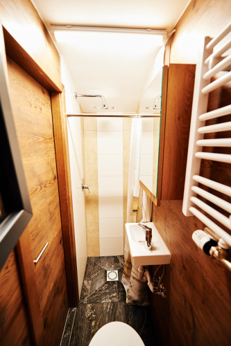 L’alloggio Il carro dei nomadi ospita fino a 3 persone. Il letto pieghevole è adatto a 2 persone e dispone di pratici cassetti per riporre oggetti sotto di esso. Sopra il letto, in larghezza, si trova il terzo posto letto. Dormirai su materassi spessi e comodi, avrai una lampada da lettura accanto a te e in zona notte c’è una TV a schermo piatto. In cucina troverai un frigorifero, un microonde, due fornelli e un lavandino. Il bagno è dotato di doccia, WC e lavabo. L’intero carro dei nomadi è riscaldato, quindi puoi soggiornare comodamente anche in inverno.
