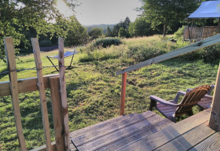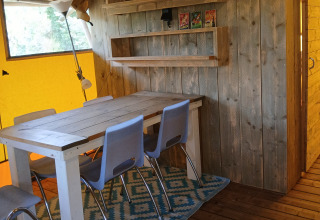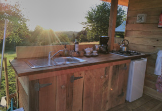 Svegliati in una tenda eco-lodge unica, dove comfort e sostenibilità si uniscono. Goditi due camere da letto con spazio per cinque adulti e un neonato, inclusi materassi ortopedici extra lunghi da 210 cm per un sonno profondo. Rilassati nel bagno di lusso con doccia a pioggia, acqua calda da pannelli solari e prodotti per la cura ecologici. Cucina nella cucina completamente attrezzata in legno riciclato con piano cottura a 4 fuochi, frigorifero e raccolta differenziata. Soggiorna in una piazzola spaziosa di almeno 200 m² con tavolo da picnic, amaca e comode sedie con vista. Vivi in tranquillità in un campeggio senza fumo e senza auto, senza cani, con giochi naturali per bambini e un'area centrale per barbecue e falò.