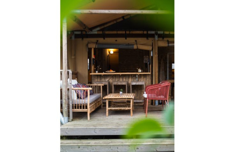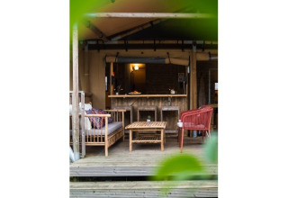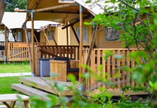 Nel soggiorno trovi un'accogliente area salotto con TV, divano e sedie. La cucina è completamente attrezzata, dotata tra l'altro di un microonde, frigorifero retrò con congelatore e tutti gli utensili necessari. Potrai goderti anche il bagno privato: la doccia a pioggia offre comfort e stile. Nel bagno sono presenti anche un WC e un lavandino. Ci sono due camere da letto, di cui una con letto matrimoniale. A seconda della dimensione della tenda, nella seconda camera trovi uno o due letti a castello. Al tuo arrivo i letti saranno già pronti per te! Infine, davanti alla tenda c’è una grande veranda. Qui puoi rilassarti sul divano – è il posto perfetto per godersi la colazione al mattino.