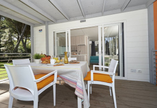 Il tuo chalet dispone di due accoglienti camere da letto, un luminoso soggiorno e un angolo cottura ben attrezzato, ideale se ami pasti semplici e mattinate tranquille sorseggiando il caffè con i tuoi tempi. Esci sulla tua soleggiata terrazza con mobili da giardino e goditi lunghe e pigre serate all'aria aperta. C'è parcheggio privato accanto allo chalet, e per il massimo comfort puoi accendere l'aria condizionata (disponibile a pagamento) dopo una calda giornata di sole.
