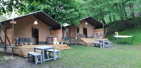 Sulla veranda puoi rilassarti su due divani lounge o sull'amaca. Sul posto campeggio troverai anche un tavolo da pranzo in legno con panche e due sedie da campeggio regolabili. È presente anche un barbecue a gas. La tenda non dispone di un bagno privato; utilizzerai i servizi igienici del campeggio. Grazie all'ampia veranda e alle attrezzature esterne, la vita all'aperto è protagonista qui.