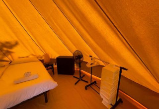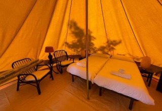 La tenda è dotata di due letti singoli. Lo spazio abitativo all’interno della tenda è quindi ben organizzato per la zona notte. Non è presente un bagno nella tenda. All’interno troverai anche un piccolo frigorifero, una piccola piastra elettrica e un mini set da cucina.