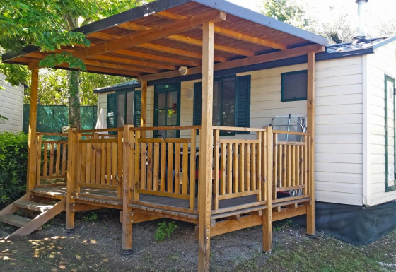 Il soggiorno con aria condizionata e riscaldamento garantisce freschezza o calore quando necessario, e l'ampia veranda con mobili da esterno invita a lunghe serate all'aperto. Sono inoltre presenti una TV, un frigorifero e un ampio armadio. Gli animali domestici purtroppo non sono ammessi, ma piscine e animazione sono sempre inclusi nel prezzo. Perfetto per chi vuole combinare comfort, tranquillità e piacere di vacanza in un'unica cottage elegante.