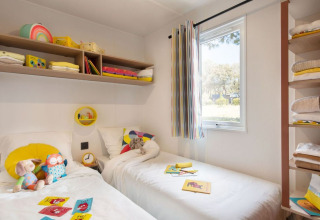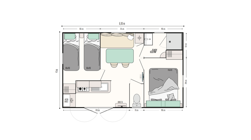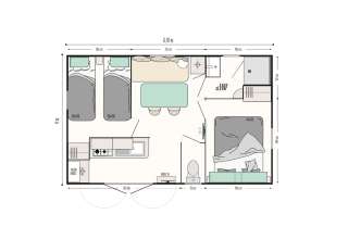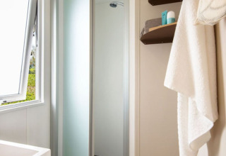 Scopri la Cottage Next L Smart e vivi il comfort con una disposizione intelligente e pratica. Questa moderna sistemazione dispone di due camere da letto: una con un letto matrimoniale e una con due letti singoli e un letto pieghevole extra. Il bagno completo con doccia offre un ulteriore comfort, mentre l'angolo cottura completamente attrezzato con macchina da caffè Nespresso e a filtro è ideale per mattine rilassanti.