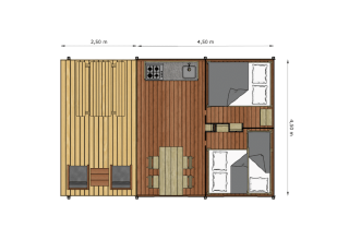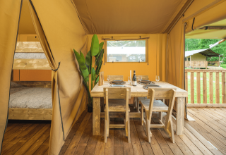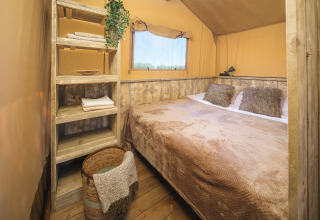Scopri la libertà del campeggio nella Glamptent Basic, adatta per 5 persone e 20 m² di accoglienza. La tenda dispone di due camere da letto: una con un letto matrimoniale e una con un letto singolo più un letto a castello, ideale per famiglie o amici. Nella zona giorno si trova un angolo cottura completamente attrezzato con microonde, frigorifero, macchina da caffè Nespresso e macchina da caffè a filtro, così pasti e caffè sono sempre a portata di mano. All'esterno ti aspetta un'ampia terrazza con mobili da esterno e barbecue elettrico, perfetta per rilassarsi e godersi la natura.