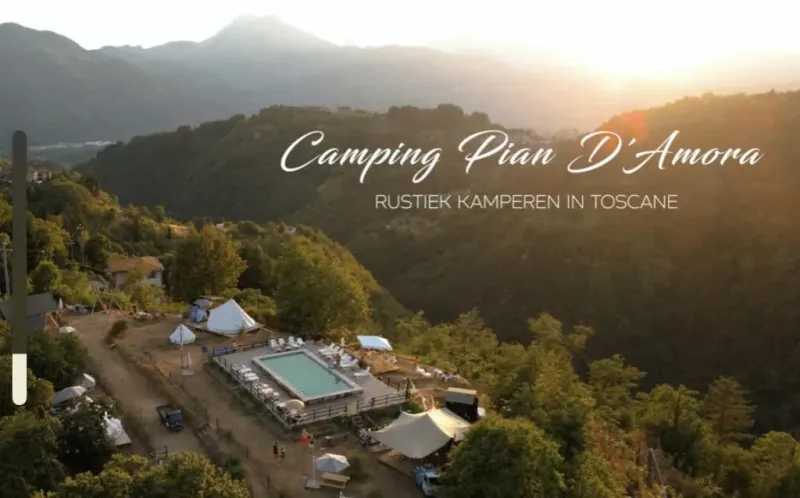 Vivi il campeggio rustico al Pian d’Amora, un piccolo campeggio a terrazze situato a 600 metri di altitudine nel nord della Toscana. In questo campeggio puoi goderti la natura, la tranquillità e lo spazio tra colline e montagne. Il campeggio è suddiviso su più terrazze, creando differenze di altezza e viste mozzafiato. In cima trovi la reception, il pool bar e la piscina con vista sulle montagne e sugli splendidi tramonti. Rilassati e rigenerati in questo campeggio dall’atmosfera accogliente.