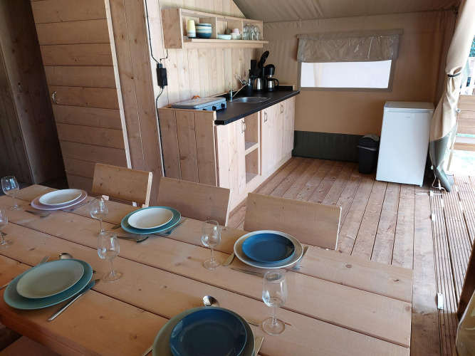 La tenda safari con servizi igienici è una tenda safari di lusso adatta a ospitare fino a 6 persone, una sistemazione ideale per una vacanza in famiglia o in gruppo! Ha una superficie di 40m2. Mangia insieme al grande tavolo con sedie, apri completamente la parte anteriore della tenda e goditi la vista e l'aria fresca. Prepara i pasti nella cucina completamente attrezzata e rilassati a fine giornata su una delle lussuose sedie o in una delle due camere da letto. In una camera da letto troverai un grande letto matrimoniale, mentre nell'altra troverai 2 letti a castello. Con una lunghezza di 2 metri, i letti sono adatti sia ai bambini che agli adulti. Per rendere la tua vacanza glamping ancora più lussuosa, la tenda safari è dotata di un bagno completo con doccia, wc e lavandino.