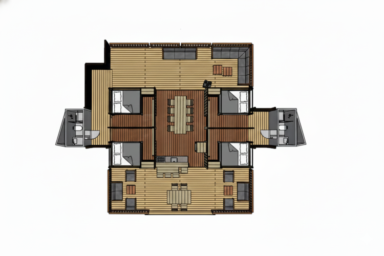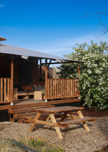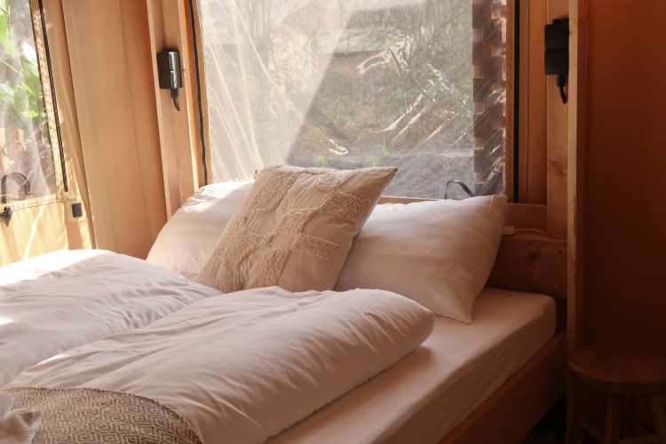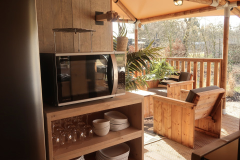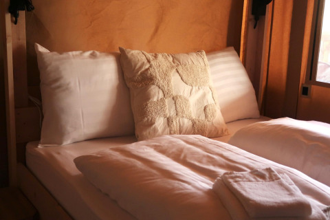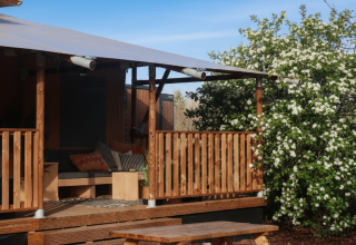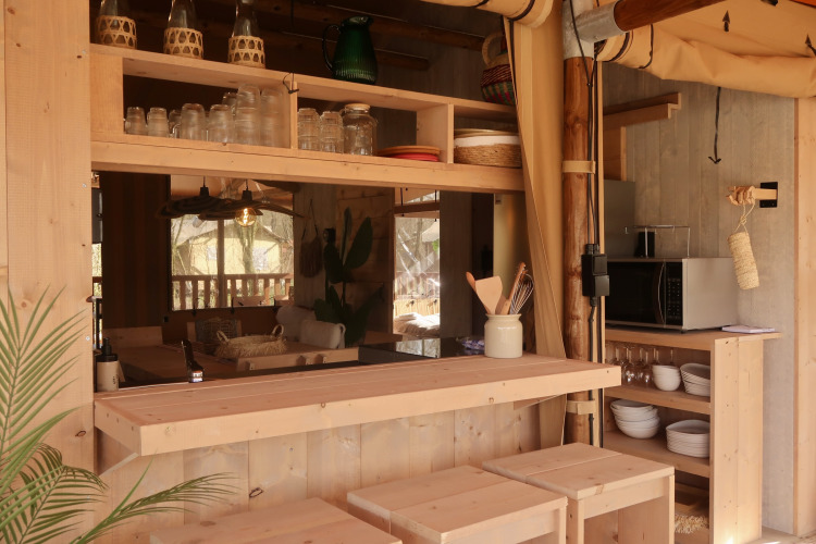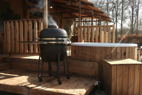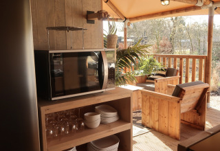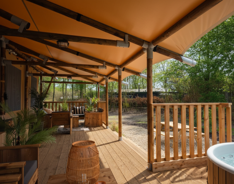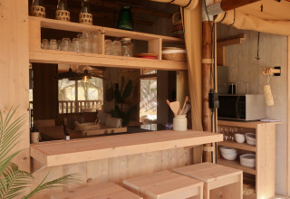 Fuggi in una elegante tenda glamping sull’acqua con vasca idromassaggio privata a legna e atmosfera mediterranea. Quattro camere da letto con letti matrimoniali, coperte elettriche e due bagni con vasca e ampia doccia offrono comfort per otto persone. La cucina abitabile è completamente attrezzata con macchina Nespresso, forno combinato, lavastoviglie e un grande tavolo da pranzo per lunghe serate insieme. Wi-Fi ultraveloce e una stufa a pellet calda rendono piacevole ogni stagione. All’esterno ti attendono una veranda, un terrazzo coperto e lettini lussuosi per rilassarsi al sole o all’ombra. Il barbecue Kamado e la cucina esterna invitano a cucinare sotto le stelle, mentre la vasca idromassaggio garantisce puro relax immersi nella natura.