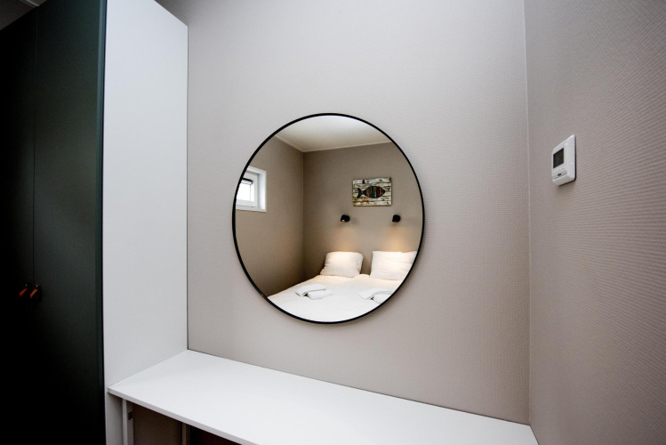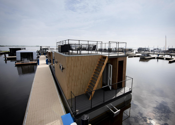 Dal molo, sali sulla spaziosa casa galleggiante. Sotto le scale che portano all'enorme terrazza sul tetto, si entra nella casa galleggiante al piano terra attraverso la porta posteriore. Su questo lato della casa galleggiante si trovano le due camere da letto con un letto matrimoniale (160x200 cm) composto da due materassi singoli separati, comodini + lampade da comodino e un armadio alto. Ci sono prese USB e USB-C, un grande specchio e una piccola scrivania con sgabello separato. L'altra camera da letto ha due letti singoli separati (80x200cm), un comodino, due armadietti con spazio per riporre le cose e lampade da comodino, oltre a prese di corrente intelligenti. Il bagno è dotato di cabina doccia, lavabo con mobile e toilette.