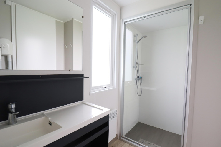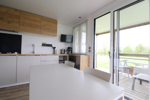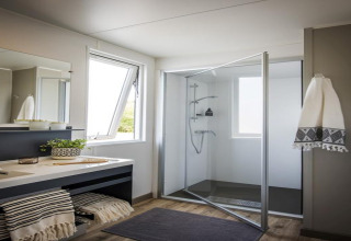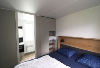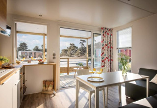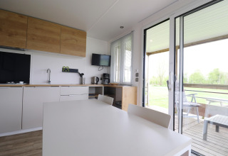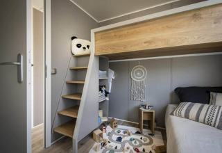 All’interno, lo chalet è luminoso, elegante e confortevole. La disposizione pratica permette a entrambe le camere di accedere direttamente a un elegante bagno in comune, così non dovrai mai attraversare il soggiorno di notte. Una delle camere dispone di una zona letto rialzata divertente – ideale per i bambini che amano avere un angolo speciale tutto per loro dove dormire e giocare. Insieme all’area giochi e alla sala ricreativa presenti nel campeggio, questo rende Terraslodge 2 una scelta perfetta per le famiglie.