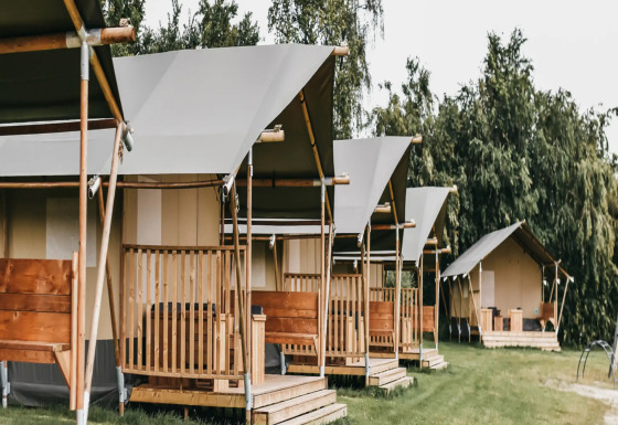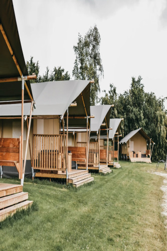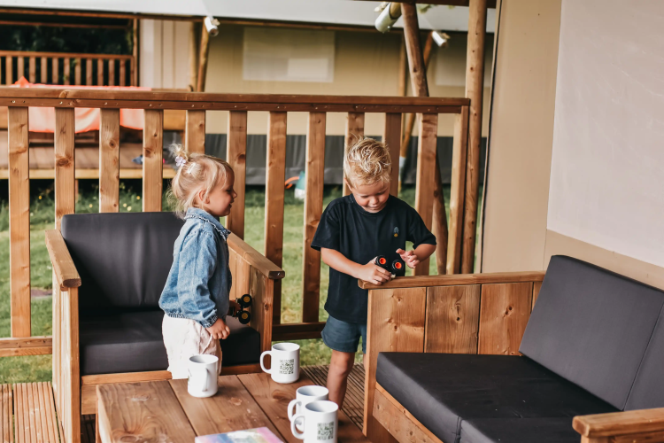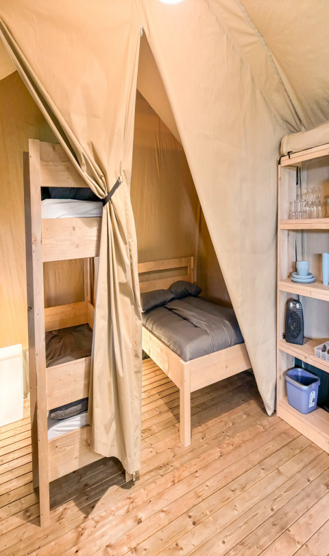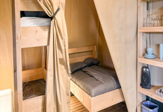 Questa tenda safari unica è dotata di tutti i comfort per una vacanza glamping perfetta! Grazie ai dettagli in legno, alla parte anteriore arrotolabile e al WC presente nella tenda, si vive la vera sensazione di campeggio all'aperto, con tutti i comfort di casa. La tenda dispone di una veranda accogliente con tettoia, ideale per godersi l'aria aperta. La safaritent è dotata di una cucina completamente attrezzata con utensili e comprende un fornello a gas sicuro a quattro fuochi, un frigorifero, una macchina per il caffè e un bollitore. Inoltre, ci sono due cabine letto nella tenda. In una delle cabine si trova un letto matrimoniale (140x200 cm) e nell'altra due letti a castello.