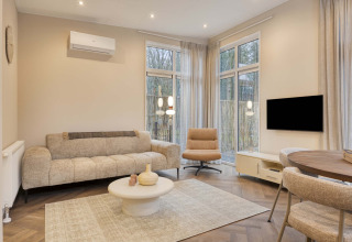 Rilassati in un soggiorno luminoso con TV a schermo piatto e inizia la giornata tranquillamente con una tazza di caffè preparata con la macchina per il caffè DE e le capsule. La cucina completamente attrezzata dispone di forno a microonde combinato, frigorifero, congelatore e lavastoviglie, così cucinare diventa facile.